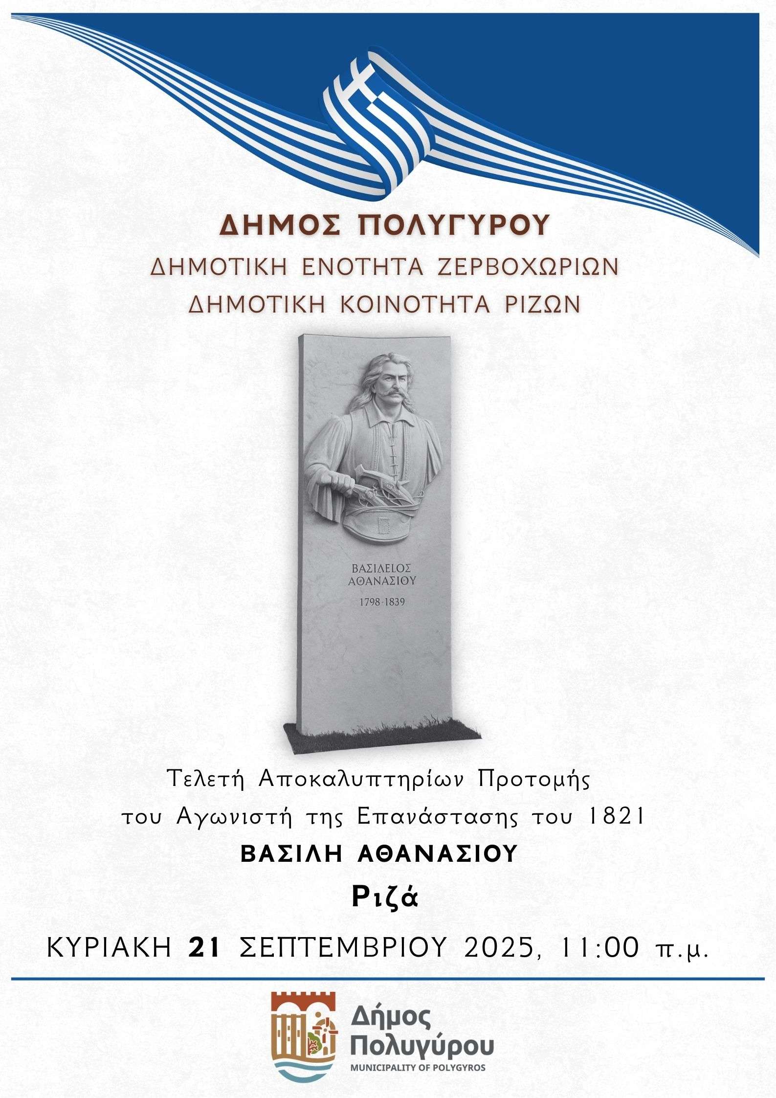 Τον Αγωνιστή της Επανάστασης του 1821, Βασίλη Αθανασίου, με καταγωγή από τα Ριζά, τιμά ο Δήμος Πολυγύρου, με τα αποκαλυπτήρια της προτομής του, που θα πραγματοποιηθούν την Κυριακή 21 Σεπτεμβρίου 2025, στις 11:00, στα Ριζά της Δ.Ε. Ζερβοχωρίων.