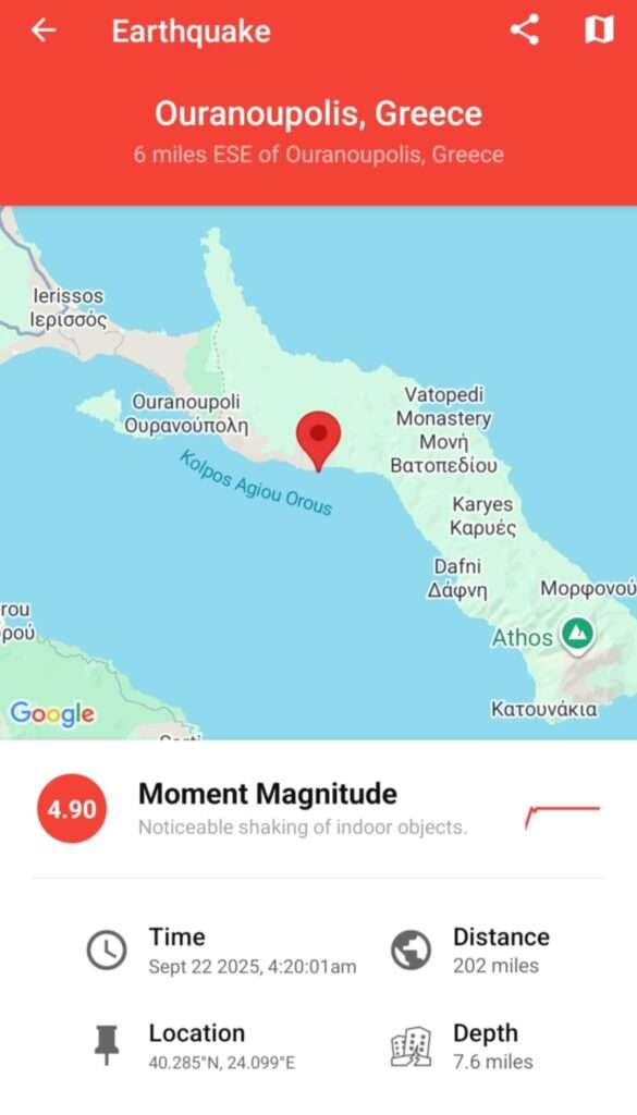 Σεισμός 4,9 Ρίχτερ σημειώθηκε στην Χαλκιδική στις 4:20 τα ξημερώματα της Δευτέρας, 22/9, στο Άγιο Όρος.