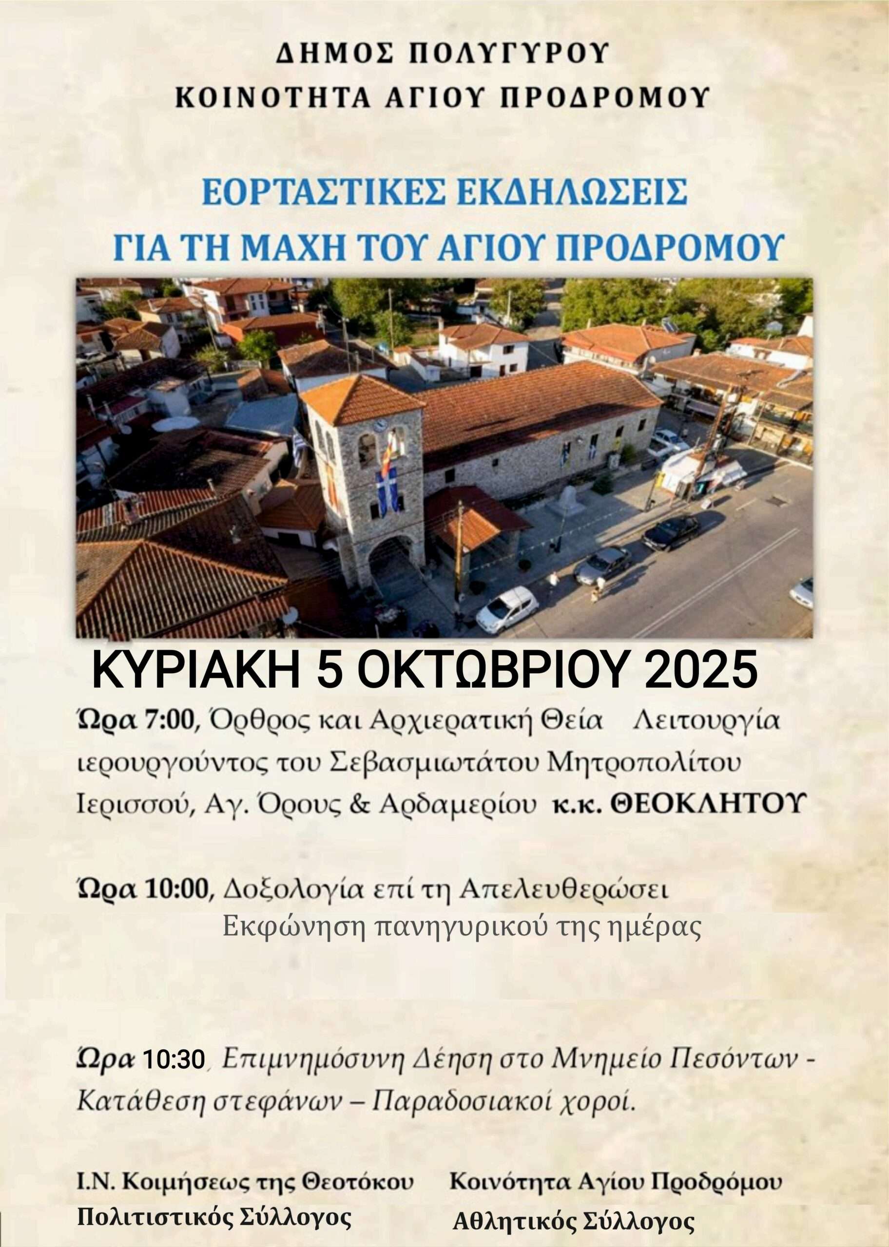 Ετήσια επιμνημόσυνη δέηση για τη μάχη της απελευθέρωσης της Χαλκιδικής από τους Τούρκους, η οποία έλαβε χώρα στον Άγιο Πρόδρομο (Ρεσιτνίκια) στις 19-20/10/1912, θα πραγματοποιηθεί την Κυριακή 5 Οκτωβρίου 2025, στον Ιερό Ναού Κοιμήσεως της Θεοτόκου στον Άγιο Πρόδρομο.