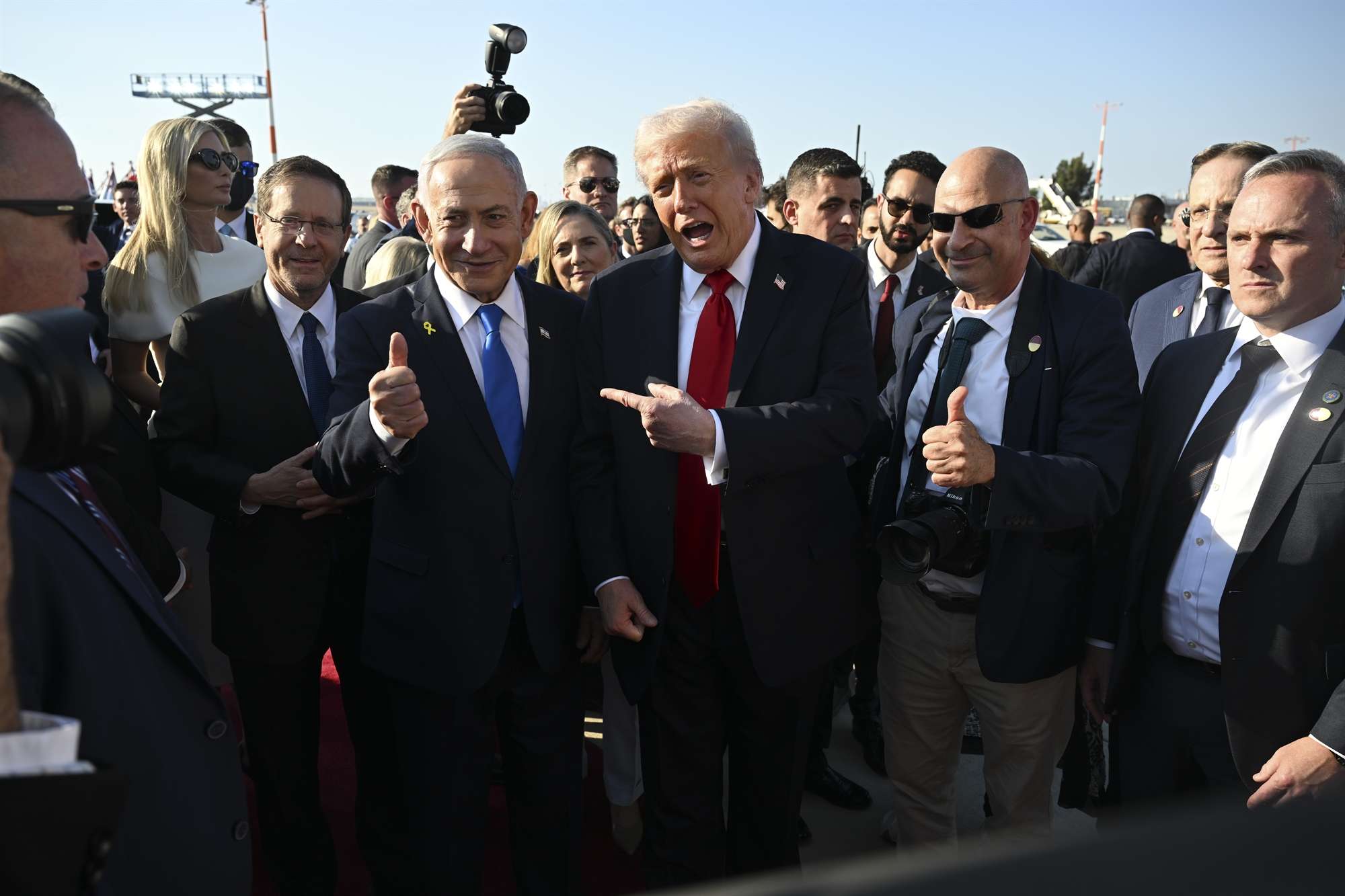 Ο Ντόναλντ Τραμπ με τον Μπέντζαμιν Νετανιάχου στο Ισραήλ λίγο πριν από την πτήση του Αμερικανού προέδρου για το Σαρμ ελ Σέιχ της Αιγύπτου. Λίγο νωρίτερα από το βήμα της Κνέσετ ο Τραμπ είπε απευθυνόμενος στον Ισραηλινό πρωθυπουργό: «Μπορείς να γίνεις και εσύ κάπως πιο συμπαθής τώρα, γιατί δεν είσαι πια σε πόλεμο». [Kenny Holston / The New York Times]