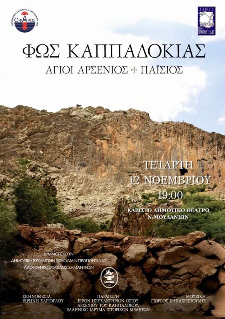 Μια ξεχωριστή εκδήλωση αφιερωμένη στην Αγιοτόκο Καππαδοκία θα πραγματοποιηθεί στα Νέα Μουδανιά, όπου θα προβληθεί το συγκλονιστικό ντοκιμαντέρ «ΦΩΣ ΚΑΠΠΑΔΟΚΙΑΣ – Άγιοι Αρσένιος και Παΐσιος».