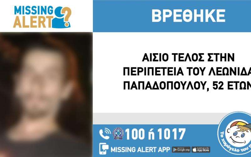 Η περιπέτεια του Λ.Π., 52 ετών, έληξε σήμερα 3/12/2025 δίνοντας τέλος στην αγωνία των δικών του ανθρώπων που τον αναζητούσαν. Ο Λ.Π. επέστρεψε στην οικογένεια του και είναι καλά στην υγεία του.