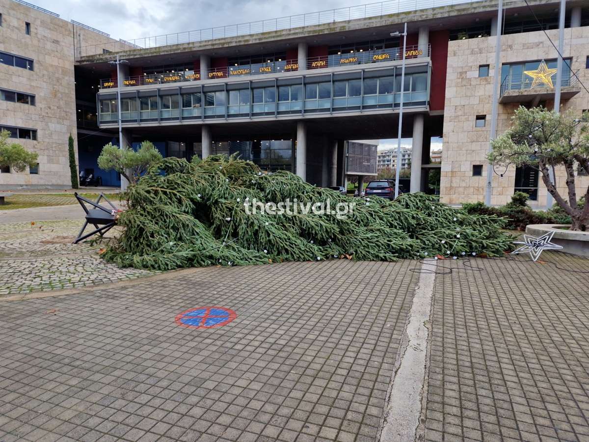 Σήμερα το πρωί, το χριστουγεννιάτικο δέντρο που είχε στηθεί μπροστά στο δημαρχείο Θεσσαλονίκης κατέρρευσε εξαιτίας των ισχυρών ανέμων που συνοδεύουν την κακοκαιρία Byron.