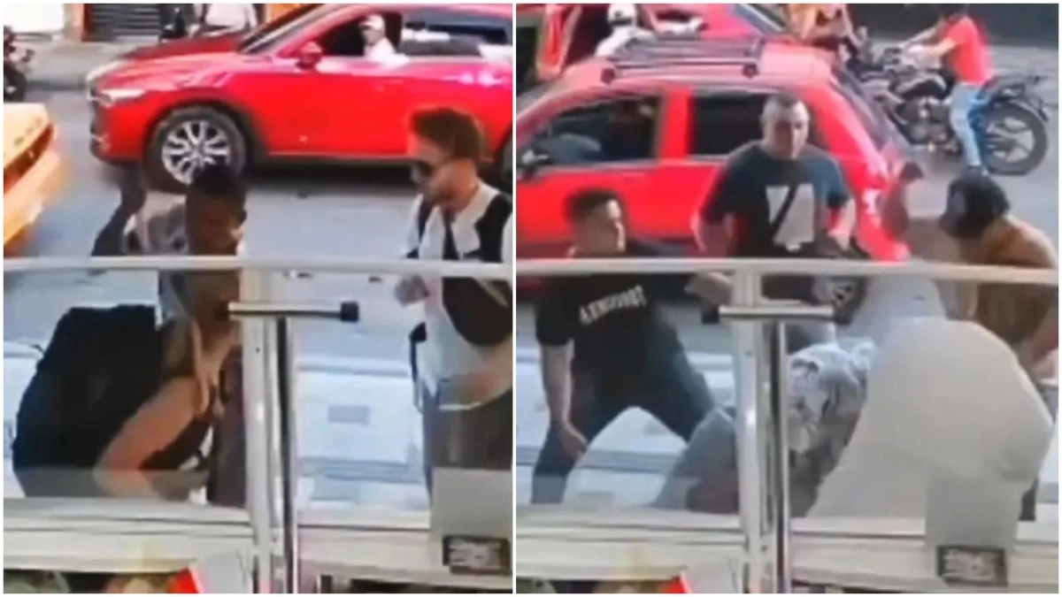 Το viral βίντεο δείχνει δύο νεαρούς ταξιδιώτες να συζητούν στην είσοδο αυτού που φαίνεται να είναι τράπεζα ή ανταλλακτήριο συναλλάγματος στην Κολομβία, όταν ένας ληστής εμφανίζεται με όπλο, πιθανότατα μαχαίρι, σύμφωνα με πλάνα από κάμερα ασφαλείας.