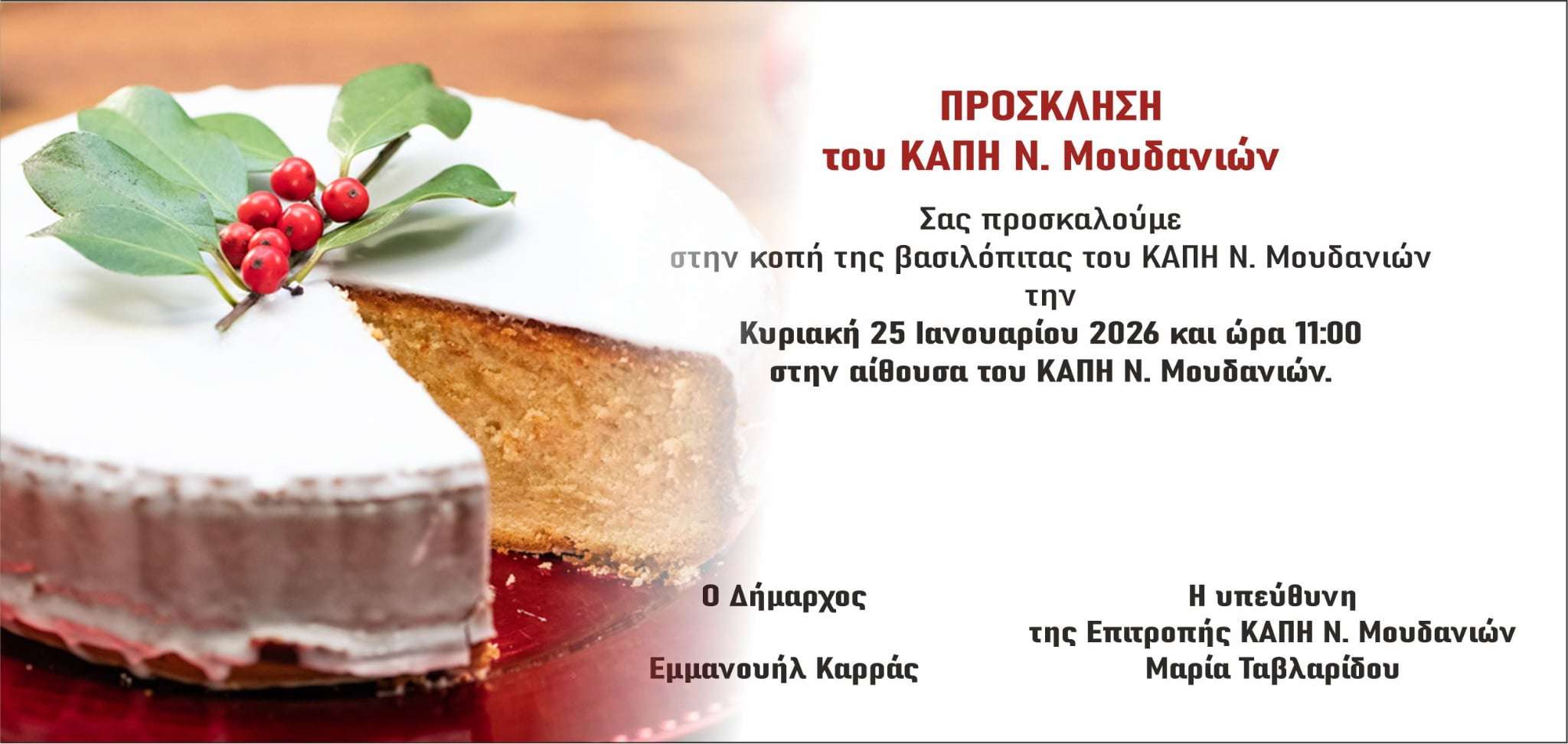 Ο Δήμος Νέας Προποντίδας σας προσκαλεί στην κοπή βασιλόπιτας του ΚΑΠΗ Ν. Μουδανιών, την Κυριακή 25 Ιανουαρίου 2026 και ώρα 11.00 π.μ. στο ΚΑΠΗ Ν. Μουδανιών.