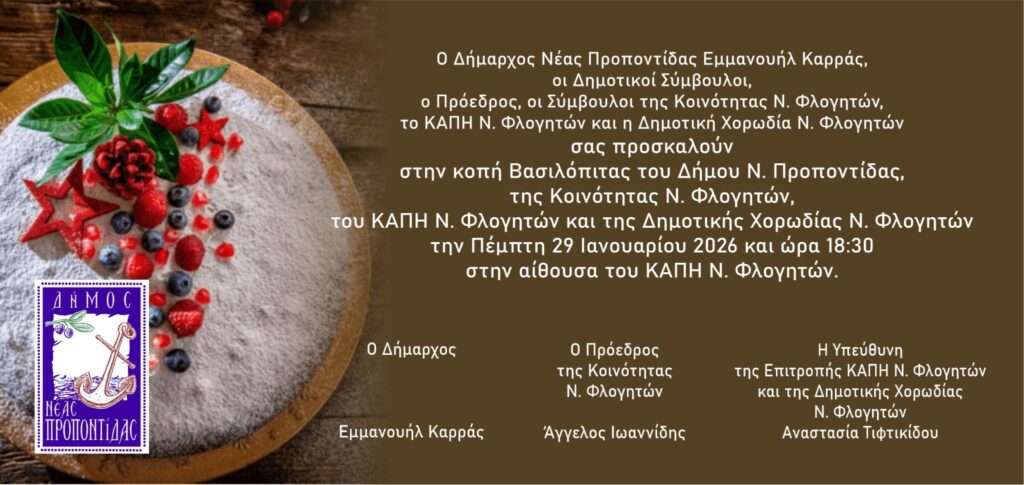 Ο Δήμαρχος Νέας Προποντίδας, μαζί με τους Δημοτικούς Συμβούλους, τον Πρόεδρο και τα μέλη της Κοινότητας Ν. Φλογητών, το ΚΑΠΗ Ν. Φλογητών και τη Δημοτική Χορωδία, σας προσκαλούν στην κοπή της Βασιλόπιτας 2026.