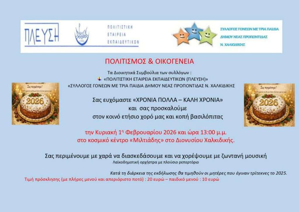Ο Σύλλογος Τριτέκνων Δήμου Ν. Προποντίδας σε συνεργασία με την Πολιτιστική Εταιρία Εκπαιδευτικών (ΠΛΕΥΣΗ) σας προσκαλούν σε μια όμορφη εκδήλωση για την κοπή της βασιλόπιτας.