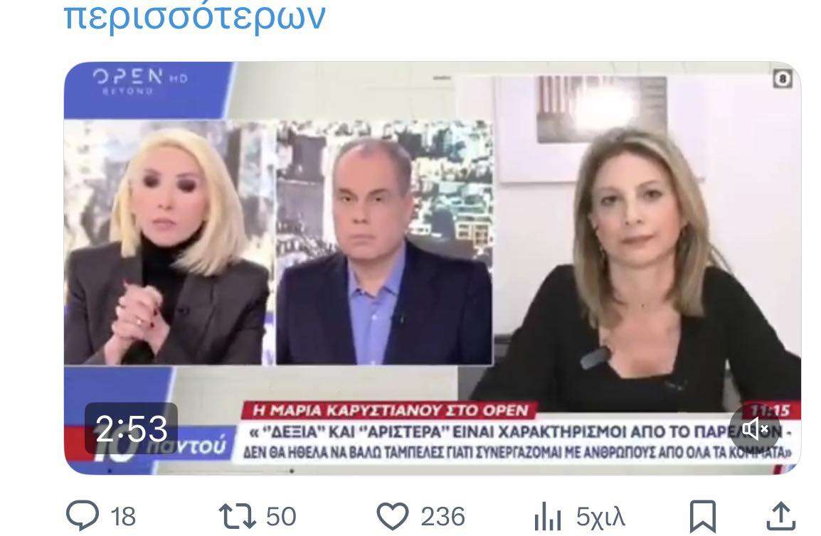 Η Μαρία Καρυστιανού κάνει λόγο για σκόπιμη διαστρέβλωση των τοποθετήσεών της, υποστηρίζοντας ότι η συζήτηση μετατοπίστηκε εσκεμμένα, προκειμένου να αποφευχθεί η ανάδειξη θεμάτων όπως τα κυβερνητικά σκάνδαλα, η θεσμική εκτροπή, η ακρίβεια, η φτωχοποίηση των πολιτών, καθώς και η κρίση σε υγεία και παιδεία.