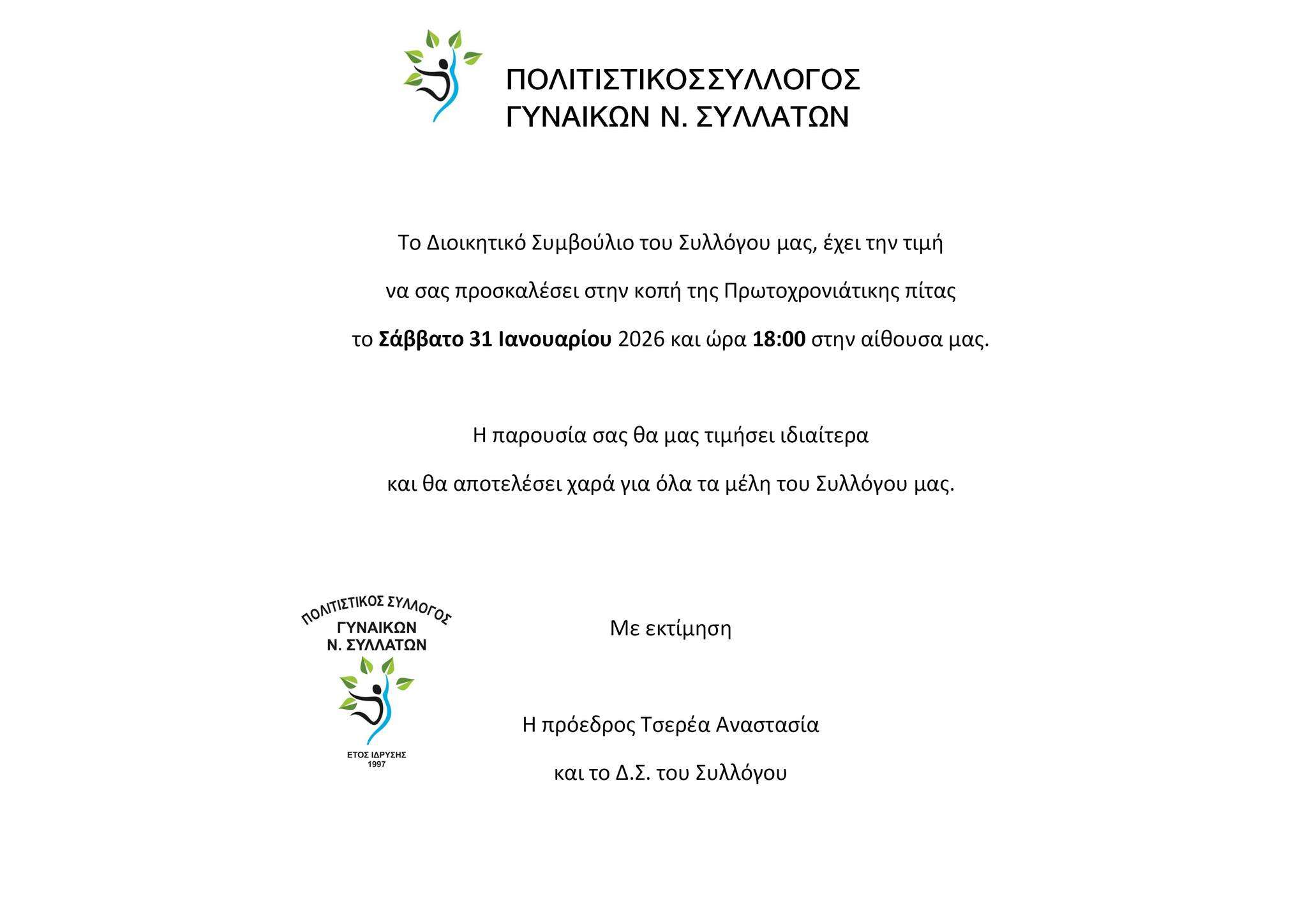 Ο Πολιτιστικός Σύλλογος Γυναικών Νέων Σιλάτων απευθύνει ανοιχτή πρόσκληση σε μέλη και φίλους για την καθιερωμένη εκδήλωση κοπής της βασιλόπιτας για το νέο έτος 2026, σε ένα ζεστό και εορταστικό κλίμα.