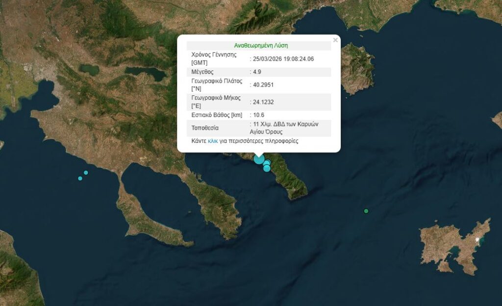 Το επίκεντρο εντοπίστηκε λίγα χιλιόμετρα βορειοδυτικά των Καρυών, ενώ η δόνηση έγινε αισθητή μέχρι και τη Θεσσαλονίκη. Μέσα σε λίγα λεπτά ακολούθησαν και άλλοι μικρότεροι σεισμοί, ενισχύοντας την αίσθηση ότι πρόκειται για ένα φαινόμενο που έχει διάρκεια και «επιμένει» στην περιοχή.
