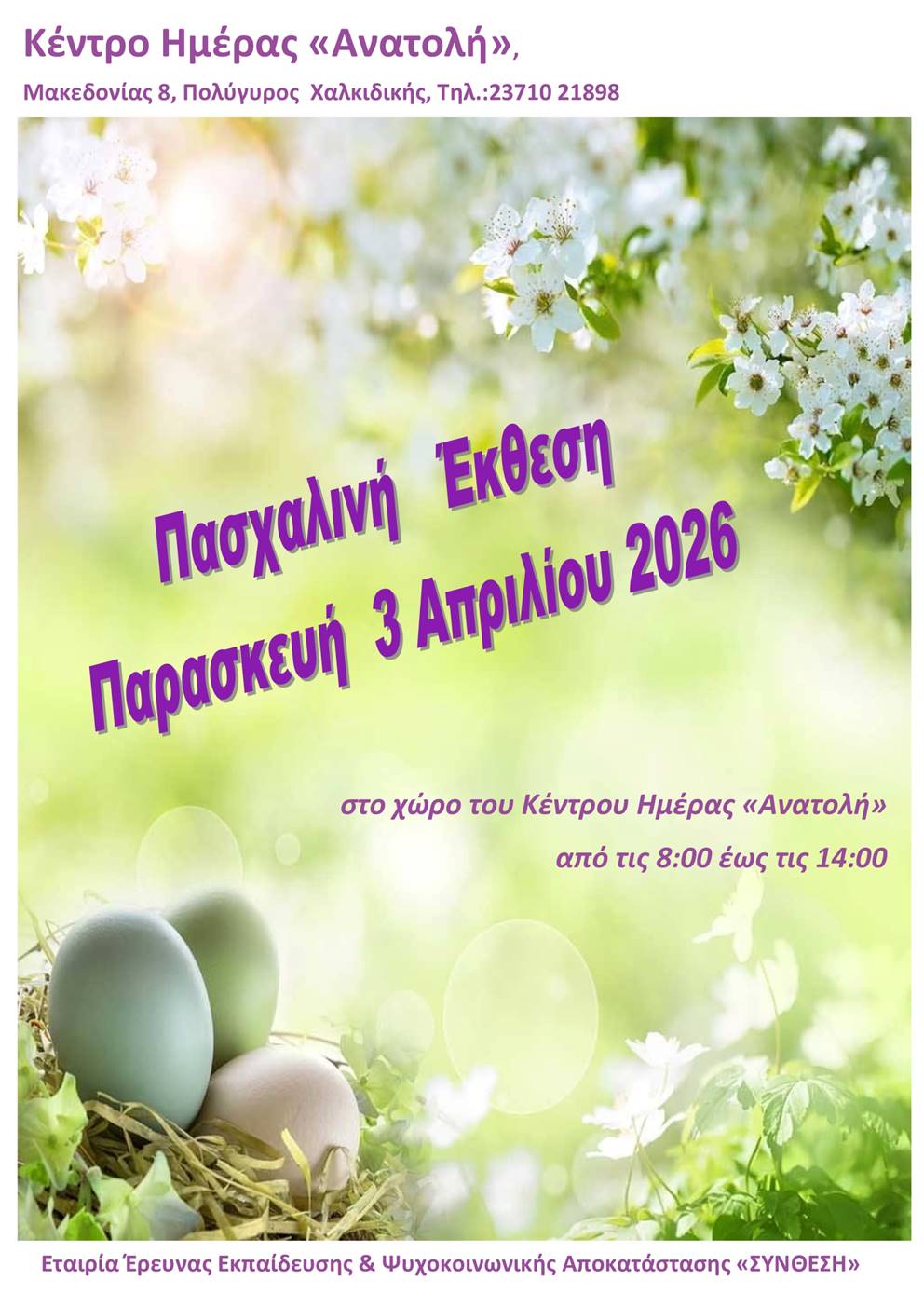 Μια όμορφη πασχαλινή εκδήλωση ετοιμάζεται στον Πολύγυρο Χαλκιδικής, καθώς το Κέντρο Ημέρας «Ανατολή» διοργανώνει την ετήσια Πασχαλινή Έκθεσή του, προσκαλώντας το κοινό να την επισκεφθεί.