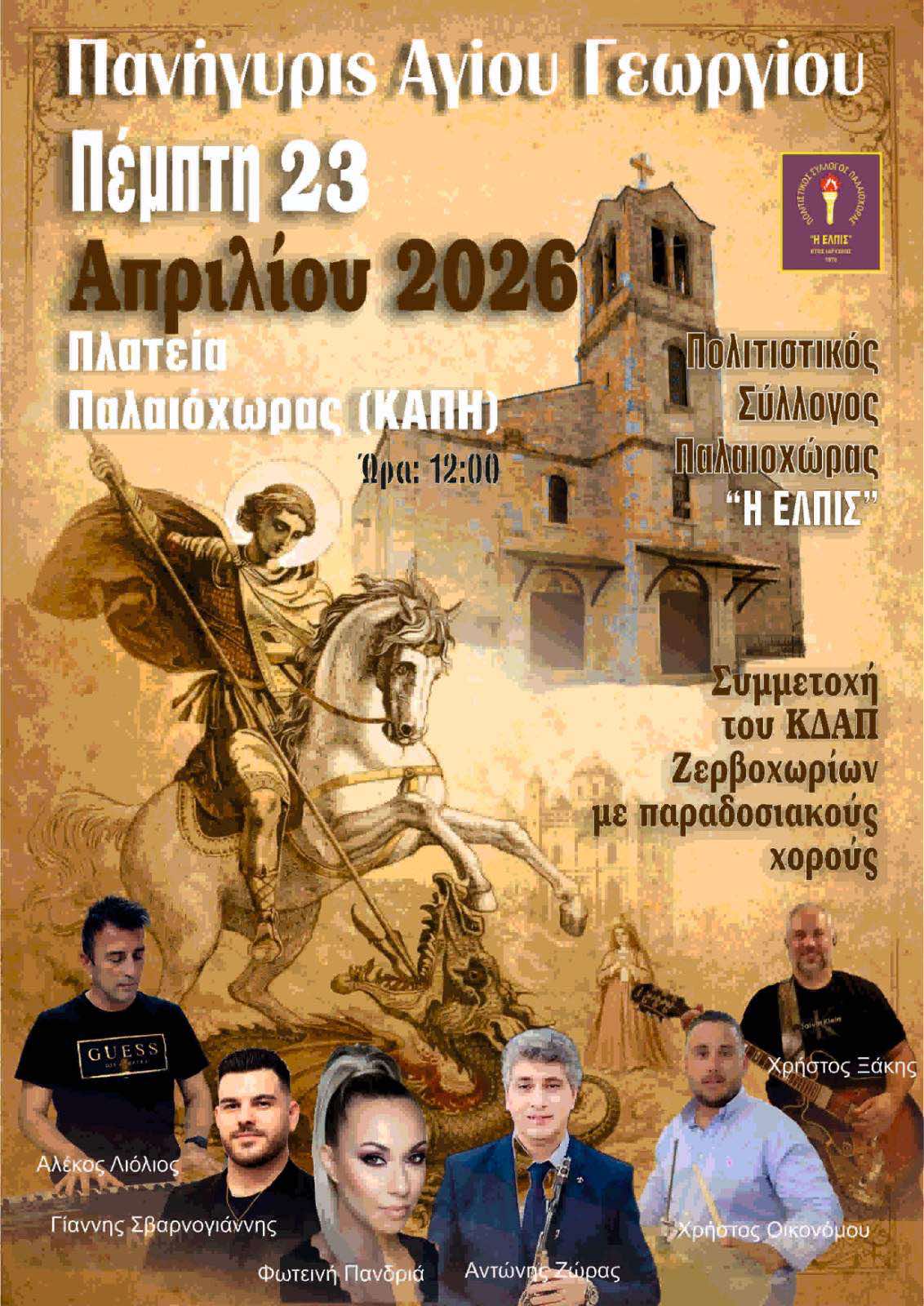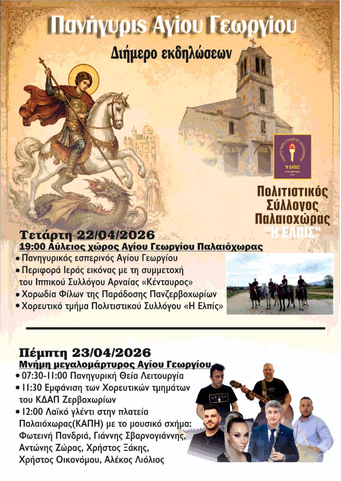Με λαμπρότητα και έντονο παραδοσιακό χρώμα θα πραγματοποιηθεί η Πανήγυρις του Αγίου Γεωργίου στην Παλαιόχωρα Χαλκιδικής, με ένα διήμερο εκδηλώσεων στις 22 και 23 Απριλίου 2026.