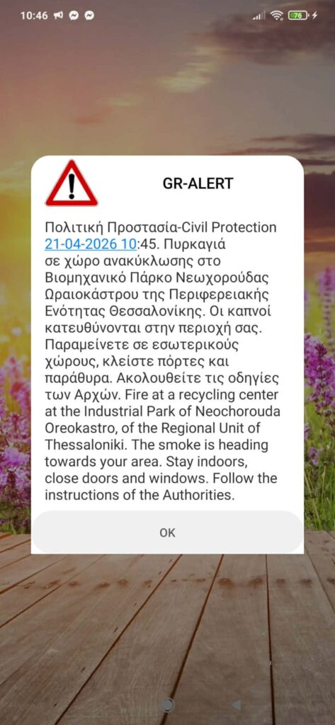 Συναγερμός έχει σημάνει στις Αρχές για φωτιά που βρίσκεται σε εξέλιξη σε εταιρεία ανακύκλωσης στην περιοχή της Νεοχωρούδας στη Θεσσαλονίκη. Σύμφωνα με πληροφορίες, η φωτιά εκδηλώθηκε σε υπαίθριο χώρο της επιχείρησης και καίγονται υλικά ανακύκλωσης και απορρίμματα. Λίγο μετά τις 10:40 μήνυμα του 112 εστάλη στα κινητά τηλέφωνα κατοίκων της δυτικής Θεσσαλονίκης, αλλά και στο κέντρο. Το μήνυμα καλεί τους πολίτες να παραμείνουν σε εσωτερικούς χώρους και να κλείσουν πόρτες και παράθυρα των σπιτιών τους.