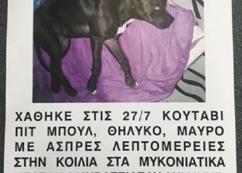 Περισσότερα...DetailsΟ σκύλος, ένα μαύρο πιτ μπουλ με άσπρα σημάδια στην κοιλιά. Χάθηκε στα Μυκονιάτικα της Νέας Καλλικράτειας στη Χαλκιδική. Έκκληση ...